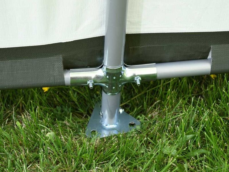 Für zusätzliche Stabilität sorgen die patentierten ShelterLock, welche an jeder Querschiene verschraubt werden und somit als Rahmenstabilisatoren dienen. Das Weidezelt ist schnell auf- und abbaubar und dadurch optimal für den saisonalen aber auch für den ganzjährigen Gebrauch geeignet. Die hochwertige Polyethylene-Plane (210g/m²) ist UV-beständig und durch eine spezielle Versiegelung (keine Nähte) absolut wasserdicht. Ein 3,5cm massives und Premium beschichtetes Stahlgestell verhindert Rostbildung und garantiert eine hohe Lebensdauer. Ein Fundament ist nicht erforderlich. In nur einer Box verpackt.