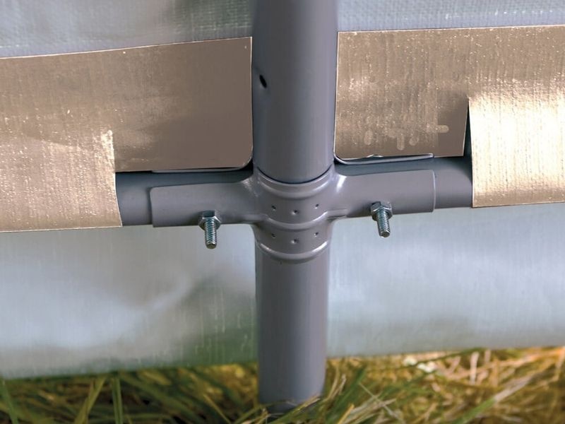 Ein 3,5cm massives und Premium beschichtetes Stahlgestell verhindert Rostbildung und garantiert eine hohe Lebensdauer der Zeltgarage. Im Eingangsbereich ist eine Tür (BxH 150×130cm) mit 2 Reißverschlüssen und Befestigungs-Gummis eingearbeitet. Verstärkte Rückwand für zusätzliche Stabilität.