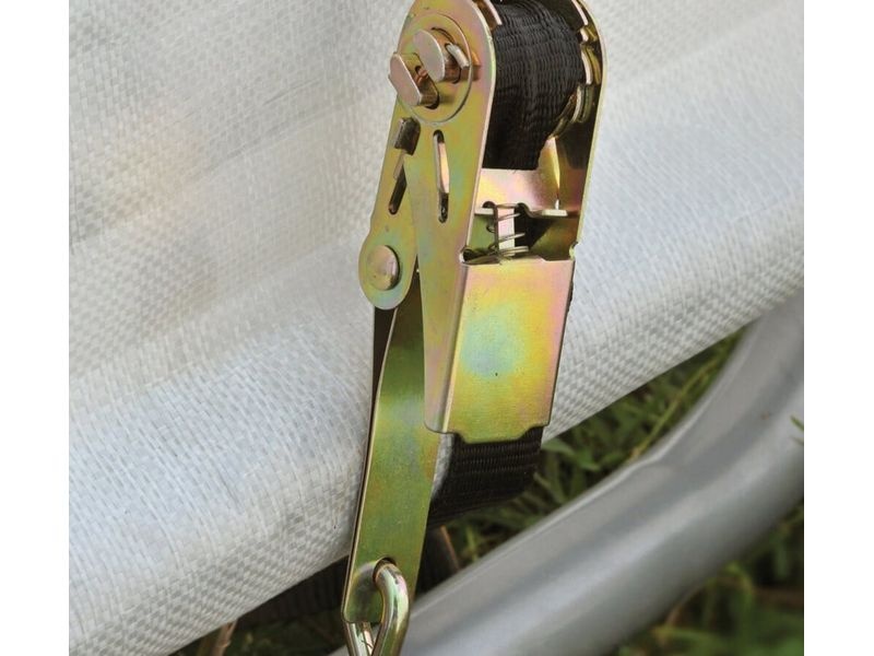 8 Stk. mitgelieferte Zurrgurte sichern die Festigkeit der Plane am Gestell bei Wind und Wetter. Im Lieferumfang sind 4 Stk. Sturmanker (38cm) zur festen Verankerung im Boden enthalten. Ein Fundament ist nicht erforderlich. In nur einer Box verpackt.