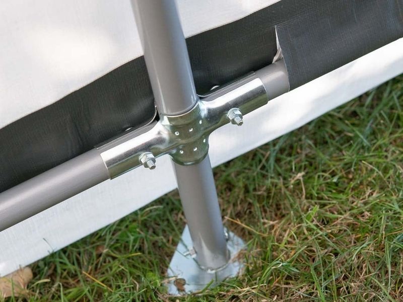 In die Tür sind 2 Reißverschlüsse sowie und Befestigungs-Gummis eingearbeitet. Die verstärkte Rückwand sorgt für zusätzliche Stabilität. Die mitgelieferten Zurrgurte (8 Stück) sorgen für eine sichere Befestigung der Plane am Gestell. Ebenfalls im Lieferumfang enthalten sind 4 Sturmanker (38cm) zur festen Verankerung im Boden. Ein Fundament ist nicht erforderlich.