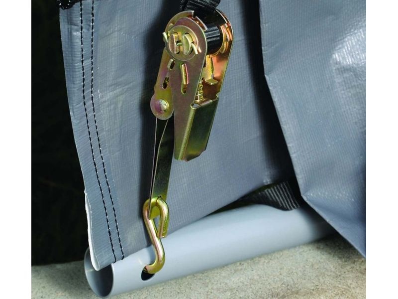 Patentierte Stabilisatoren (ShelterLogic® 3X Steel Stabilizers) gewährleisten eine 3× höhere Belastbarkeit der Konstruktion. Zum Eingangsbereich ist eine Tür (BxH 200×180cm) mit 2 Reißverschlüssen und Befestigungs-Gummis zum Aufrollen eingearbeitet. 8 mitgelieferte Zurrgurte sichern die Festigkeit der Plane am Gestell bei Wind und Wetter. Im Lieferumfang sind 4 Sturmanker (38cm) zur festen Verankerung im Boden enthalten. Ein Fundament ist nicht erforderlich.