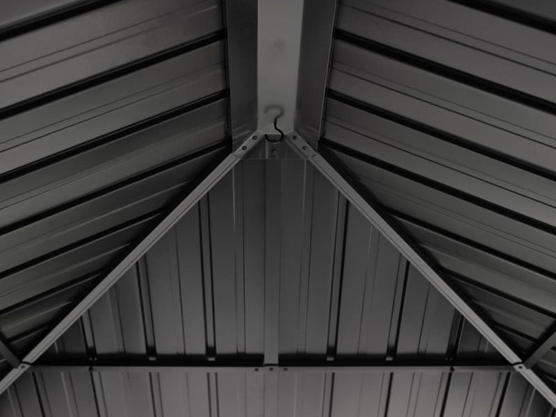 Der Gartenpavillon besteht aus hochwertigen, korrosionsbeständigen Materialien. Die Konstruktion ist aus robustem, verzinktem Aluminium gefertigt. Die einzelnen Pfosten haben eine Stärke von 12 cm und sind mit Edelstahlschrauben verbunden – das sorgt für eine besonders stabile Bauweise.
