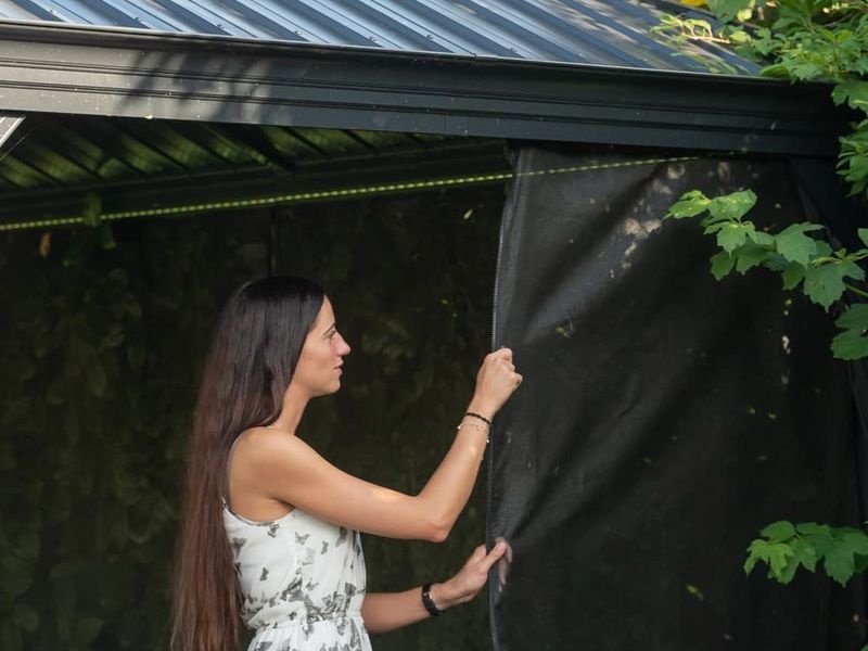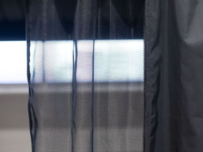 Der Pavillon wird mit Nylon-Moskitonetzen geliefert. Polyestervorhänge sind optional erhältlich. Dank eines Doppel-Schienen-Systems können beide Elemente gleichzeitig angebracht werden – im Gegensatz zu vielen anderen Modellen muss man sich hier nicht entscheiden: Moskitonetz und Vorhänge können gleichzeitig verwendet werden.