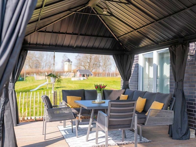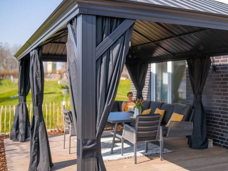 Der Aluminium-Gartenpavillon schafft einen angenehmen und gemütlichen Rückzugsort – direkt neben Ihrem Haus oder überall im Garten. Er ist mit einem Moskitonetz ausgestattet, das Sie an warmen Sommerabenden zuverlässig vor Mücken schützt.