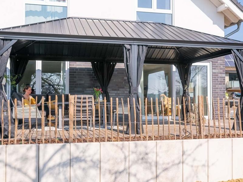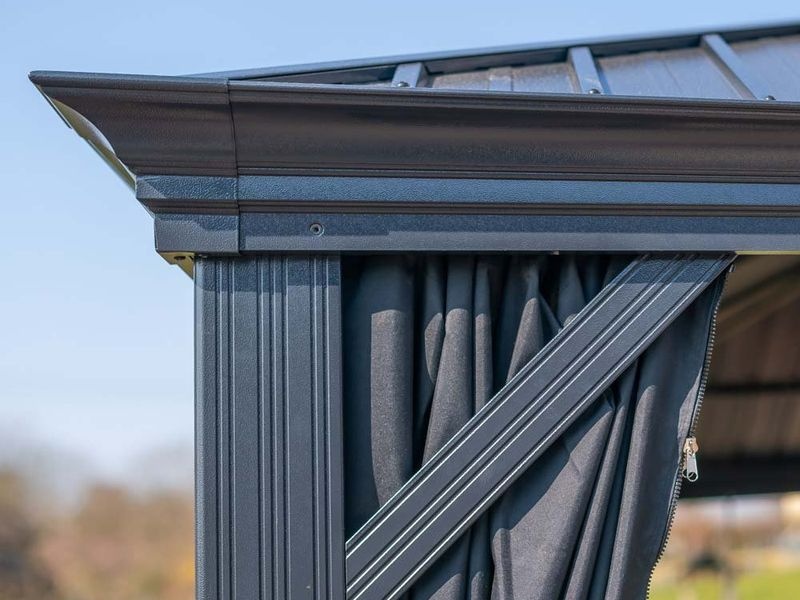 Der Gartenpavillon besteht aus hochwertigsten, korrosionsbeständigen Materialien. Die Konstruktion ist aus robustem, verzinktem Aluminium gefertigt. Die einzelnen Pfosten haben eine Stärke von 12 cm und werden mit Edelstahlschrauben verbunden – das sorgt für eine besonders stabile Bauweise.