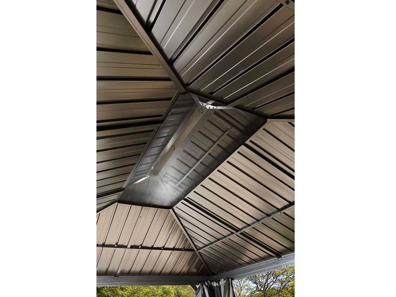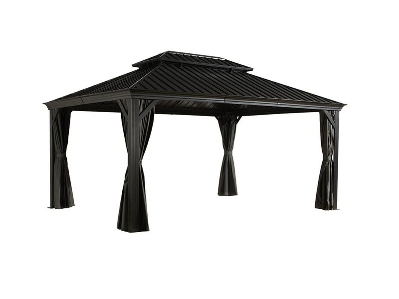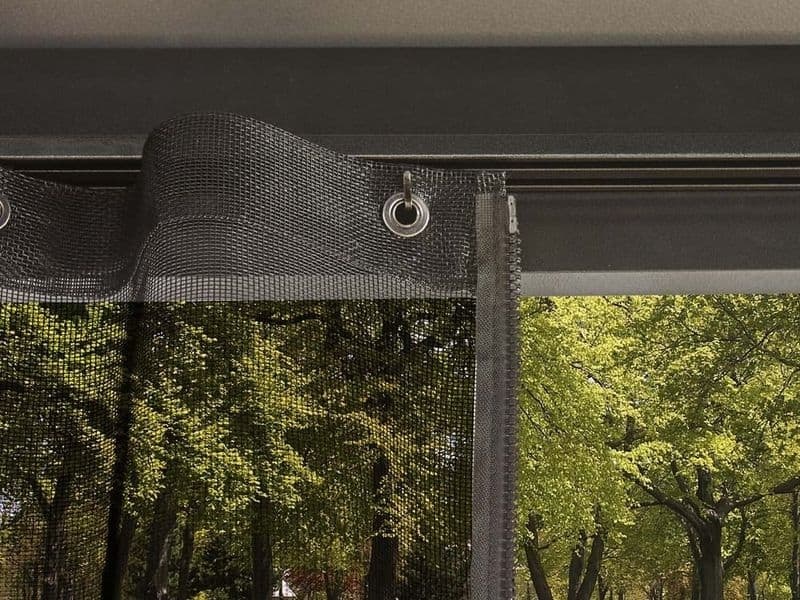 Mit doppeltem Dach zur besseren Durchlüftung und Vermeidung von Hitzestau. Mit integrierten Regenrinnen für einen geregelten Abfluss von Regenwasser. Im Lieferumfang enthalten sind Moskitonetze aus Nylon und zweigleisige Laufschienen zur zusätzlichen Anbringung von Vorhängen (seperat als Zubehör erhältlich). Im Gegensatz zu anderen Modellen gilt hier nicht entweder oder, sondern es können sowohl Moskitonetze (bereits inbegriffen) als auch Vorhänge gleichzeitig genutzt werden.