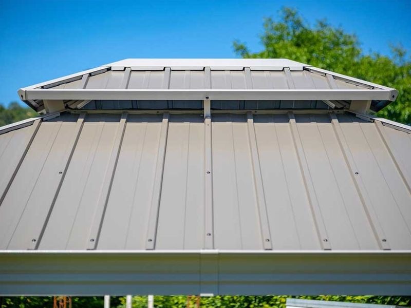 Das Dach besteht aus formschönem, widerstandsfähigem Stahl und bietet eine außergewöhnlich hohe Stabilität. Es hält mühelos Regen, Schnee und UV-Strahlung stand – der Pavillon kann daher ganzjährig im Freien stehen bleiben. Dank der integrierten Regenrinnen wird das Regenwasser gezielt abgeleitet.