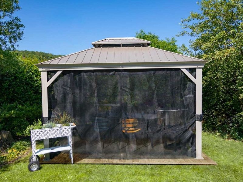 Der Aluminium-Gartenpavillon schafft einen angenehmen und gemütlichen Ort zur Erholung – direkt neben Ihrem Haus oder an einem beliebigen Platz im Garten. Er ist mit einem Moskitonetz ausgestattet, das Sie an lauen Sommerabenden zuverlässig vor Mücken schützt.