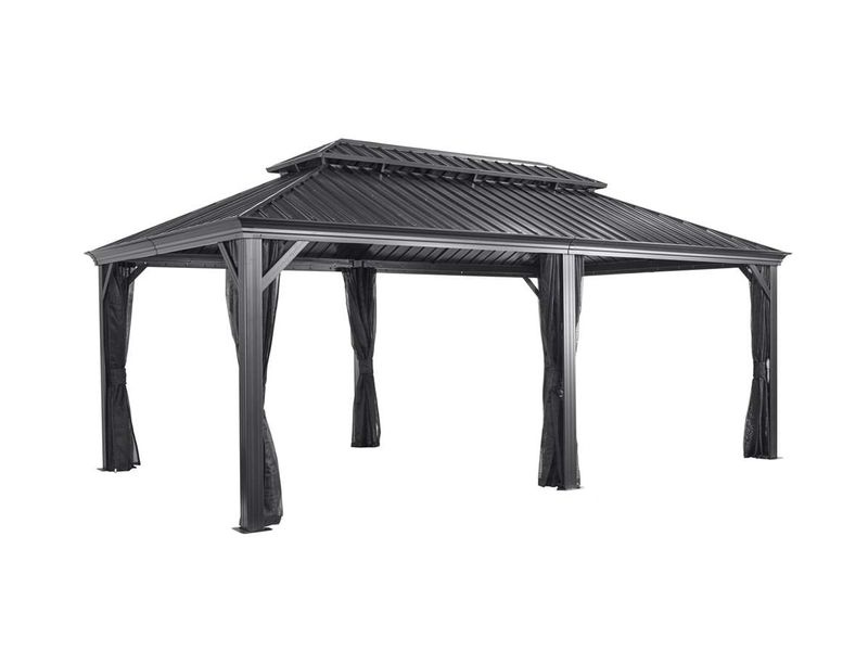 Mit doppeltem Dach zur besseren Durchlüftung und Vermeidung von Hitzestau. Mit integrierten Regenrinnen für einen geregelten Abfluss von Regenwasser. Inklusive Moskitonetzen aus beschichtetem PVC (Mesh) und zweigleisigen Laufschienen zur zusätzlichen Anbringung von Vorhängen (separat als Zubehör erhältlich). Im Gegensatz zu anderen Modellen gilt hier nicht entweder das Eine oder das Andere, sondern hier können sowohl Moskitonetze (bereits inbegriffen) und gleichzeitig Vorhänge genutzt werden.