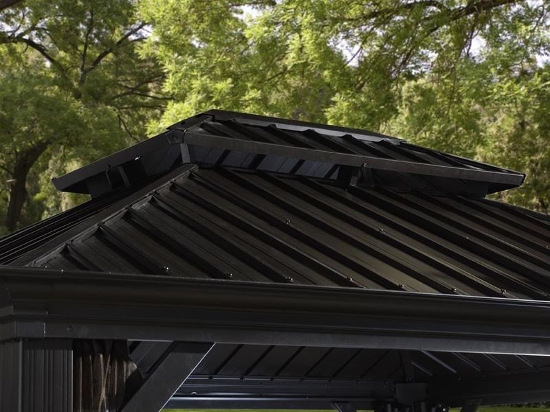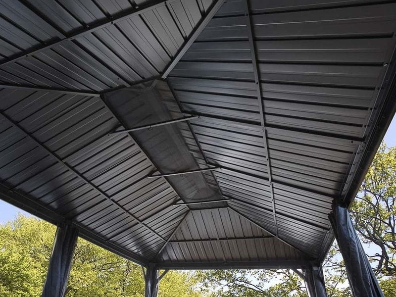 Der wesentliche Unterschied zu anderen Pavillons liegt im Material des Daches. Hier wird anstelle von Kunststoffplatten oder Stoff langlebiger und ständig formschöner Stahl verwendet.