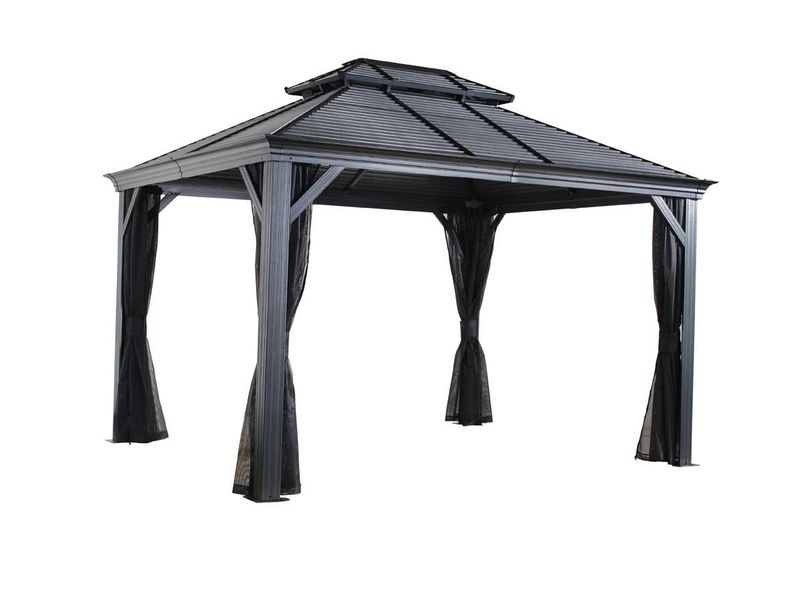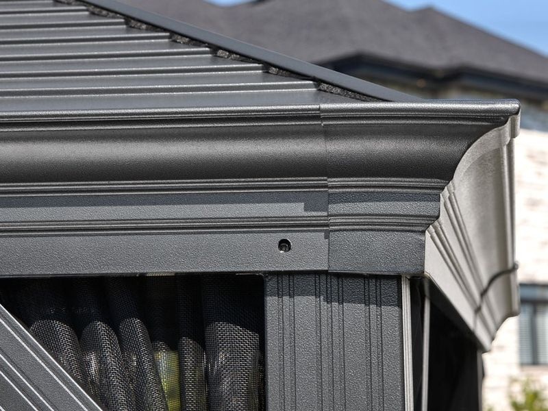 Das Dach des Pavillons besteht aus widerstandsfähigem, formschönem Stahl. Es bietet eine außergewöhnlich hohe Stabilität und hält problemlos Regen, Schnee und UV-Strahlung stand. So kann der Pavillon das ganze Jahr über draußen stehen bleiben. Inklusive Regenrinnen, die einen kontrollierten Ablauf von Regenwasser ermöglichen.