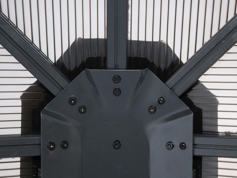 Außergewöhnliche Schneelast und alle Aluminiumteile dauerhaft rostfrei. Das Dach besteht aus 8mm starken Doppelsteglatten, ist wasserdicht und hält Witterungen wie Regen, Schnee oder Sonne (UV) problemlos Stand. Das Gleiche gilt für die massive Konstruktion aus resistentem, pulverbeschichtetem Aluminium. Auch die Schrauben bestehen aus rostfreiem Edelstahl. Der Pavillon ist für den ganzjährigen Außenbetrieb geeignet und muss daher im Winter nicht abgebaut werden.