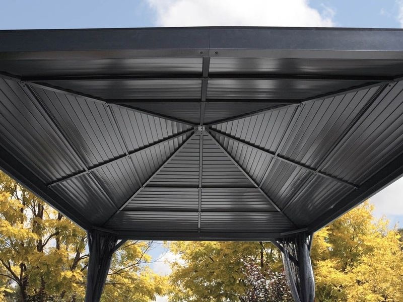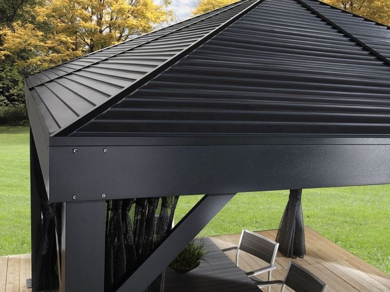Das Dach besteht aus wetterbeständigem, verzinktem Stahl, der stets schön geformt ist. Es bietet eine besonders hohe Stabilität und hält Witterungsbedingungen wie Regen, Schnee oder Sonne (UV-Strahlung) problemlos stand. Dadurch kann der Pavillon ganzjährig an Ort und Stelle bleiben.