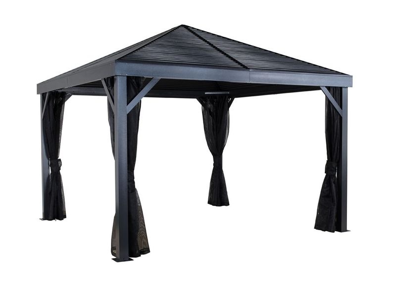 Der Aluminium-Gartenpavillon schafft einen angenehmen und gemütlichen Ort zur Entspannung – direkt neben Ihrem Haus oder an einem beliebigen Platz im Garten. Er ist mit einem Moskitonetz ausgestattet, das Sie an warmen Sommerabenden zuverlässig vor Mücken schützt.