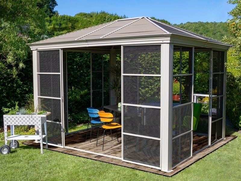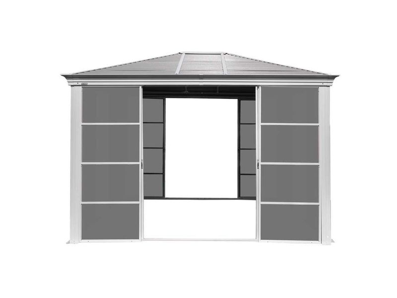 Im Lieferumfang enthalten sind doppelte Schiebetüren auf allen vier Seiten des Pavillons. Sie ermöglichen einen komfortablen Zugang und ausreichend Bewegungsfreiheit im Inneren.