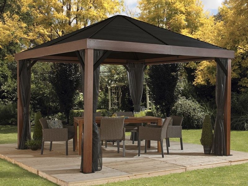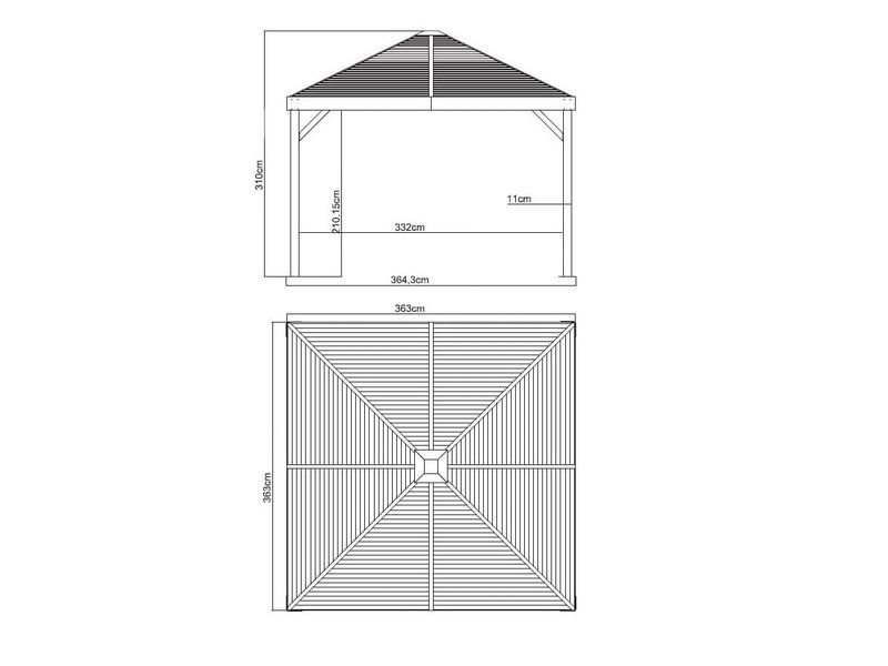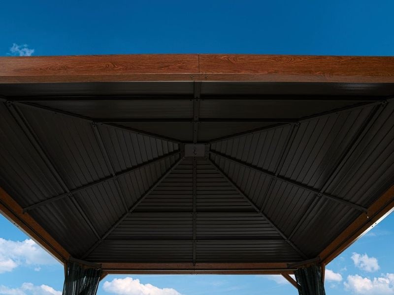 Das Dach ist aus witterungsbeständigem, verzinktem Stahl gefertigt und formschön gestaltet. Es bietet eine besonders hohe Stabilität und hält problemlos Wetterbedingungen wie Regen, Schnee oder Sonne (UV-Strahlung) stand. Dadurch kann der Pavillon das ganze Jahr über an Ort und Stelle bleiben.