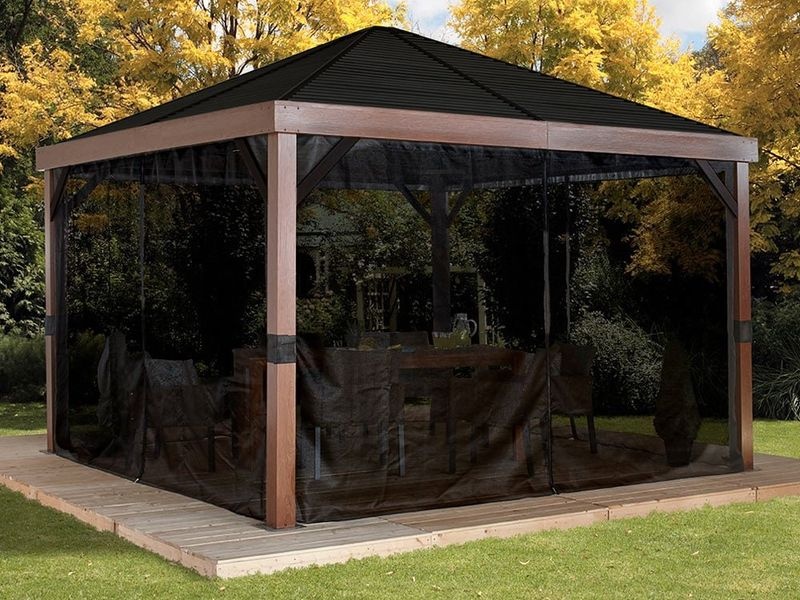 Der Aluminium-Gartenpavillon schafft einen angenehmen Ort zur Entspannung – direkt neben Ihrem Haus oder überall im Garten. Er ist mit einem Moskitonetz ausgestattet, das Sie an lauen Sommerabenden zuverlässig vor Mücken schützt. Die Holzoptik des Pavillons verleiht Ihrem Garten eine besonders gemütliche Atmosphäre.