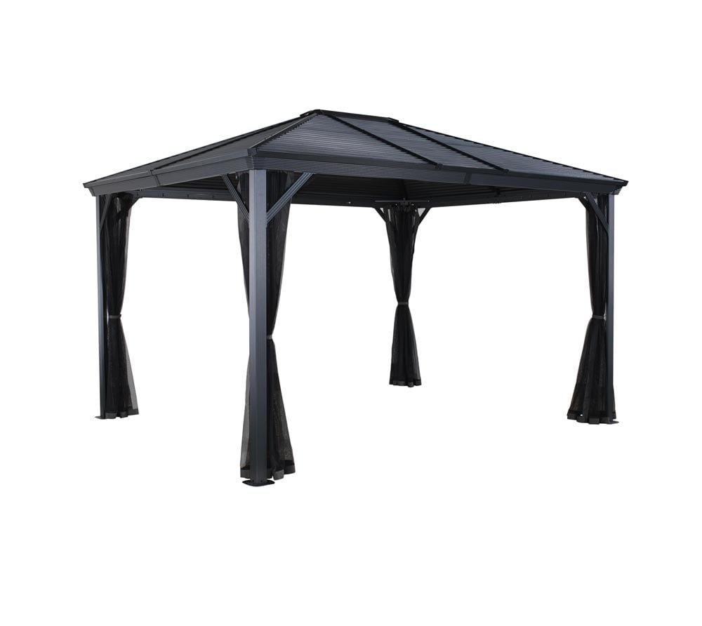Zum Pavillon können optisch abgestimmte, dunkelgraue Vorhänge separat erworben werden. Diese sorgen an heißen Sommertagen für Schatten und Privatsphäre.