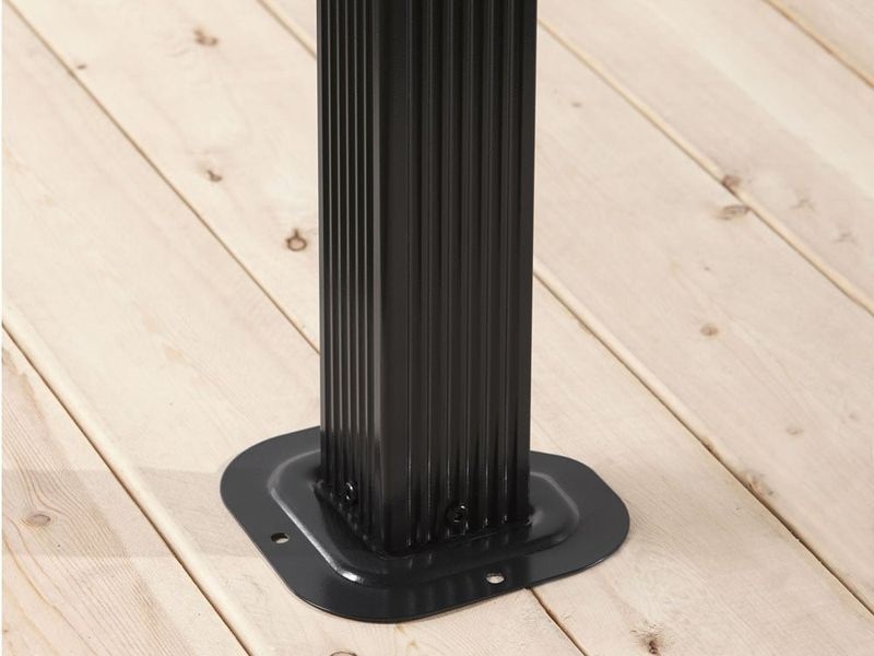 Das Modell Verona ist in einem edlen Anthrazitgrau gehalten. Optisch passende Vorhänge (Dunkelgrau) sind separat erhältlich. Der Aufbau ist unkompliziert und kann durch 2 Personen mit Hilfe der detaillierten Schritt-für-Schritt Anleitung sowie handelsüblichen Werkzeugen durchgeführt werden. Für den Aufbau sollten 4–5 Stunden eingeplant werden. Die Füße der Pfosten besitzen jeweils 3 Bohrungen. Das bedeutet, Sie benötigen zur Befestigung am Boden 12 Schrauben und Dübel.