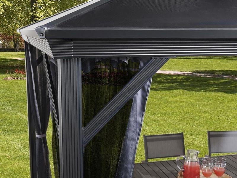Der Aluminium-Gartenpavillon schafft einen angenehmen und gemütlichen Ort zur Entspannung – direkt neben Ihrem Haus oder an einem beliebigen Platz im Garten. Er ist mit einem Moskitonetz ausgestattet, das Sie an warmen Sommerabenden zuverlässig vor Mücken schützt.