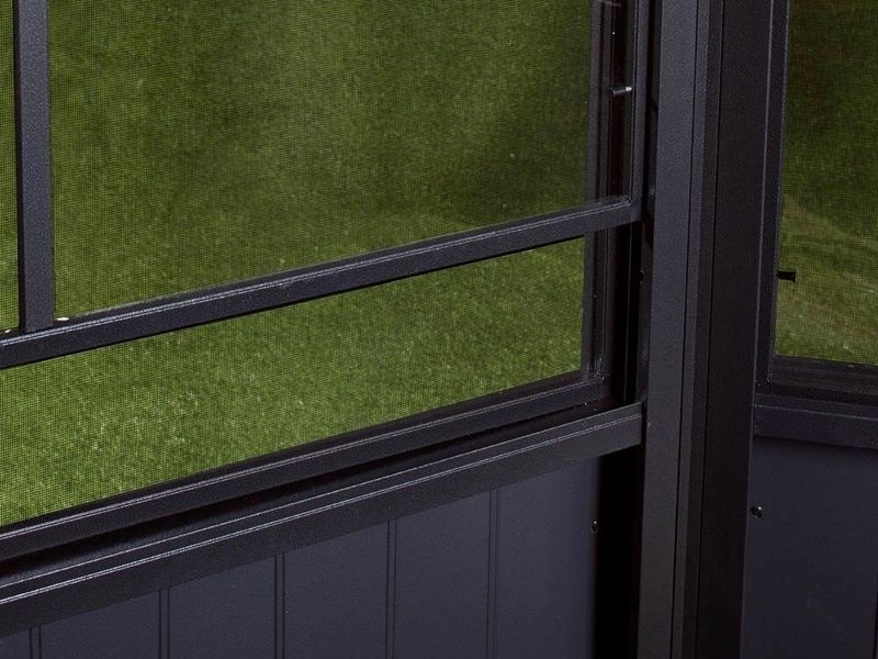 Für Licht und Belüftung sorgen 10 Fenster, jeweils eines in jedem Wandelement (94 × 74 cm). Jedes Fenster besteht aus einem Moskitonetz und einer reißfesten PVC-Folie, die zur Belüftung einfach zurückgeschoben und zur Reinigung in zwei einfachen Schritten entfernt werden kann. So genießen Sie den Blick in den Garten, auch wenn es regnet – und erleben entspannte Wohlfühlmomente.