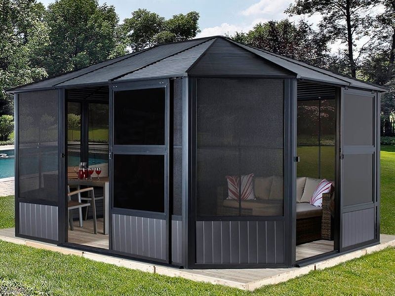 Der Aluminium-Gartenpavillon schafft einen angenehmen und gemütlichen Ort, der sich perfekt für Erholung und gemeinsame Zeit mit der Familie eignet. Im Winter verwandelt sich der Pavillon in einen wunderbaren Wintergarten. Er macht sowohl neben Ihrem Haus als auch an jedem beliebigen Ort im Garten eine gute Figur.