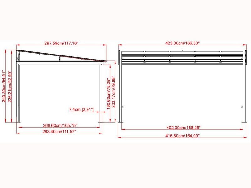 Die Konstruktion besteht aus pulverbeschichtetem Aluminium. Die einzelnen Pfosten sind 7,6 cm dick und werden mit rostfreien Edelstahlschrauben verbunden, was eine sehr stabile Struktur gewährleistet. Regenwasser wird über das Dach und die Pfosten abgeleitet.