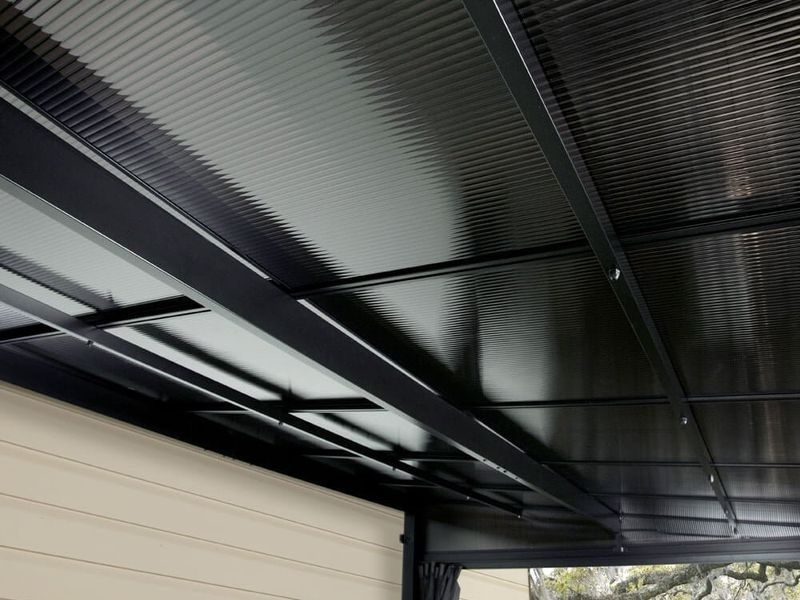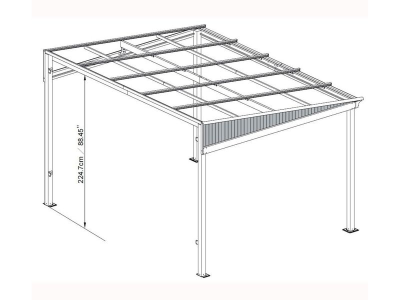 Das Dach besteht aus 8 mm starken Doppelwandplatten und zwei Verstärkungsprofilen. Es ist UV-beständig und hält einer Last von bis zu 125 kg/m² stand. Dadurch kann die Pergola ganzjährig stehen bleiben. Die Dachpaneele sind wasserdicht und trotzen den Witterungsbedingungen zuverlässig.