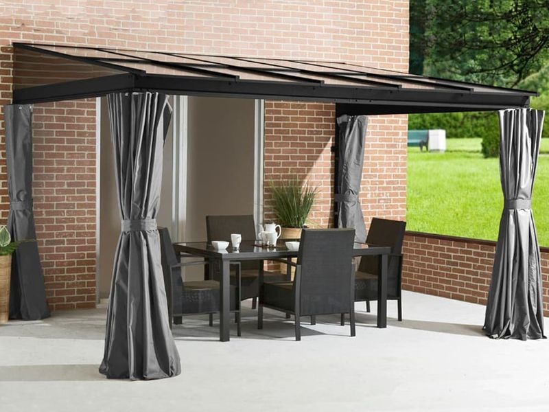 Aluminium-Wandpergola schafft einen gemütlichen und einladenden Rückzugsort direkt an Ihrem Haus. Sie ist mit einem Moskitonetz und langen Vorhängen ausgestattet, die an heißen Sommertagen Schatten und Privatsphäre bieten.