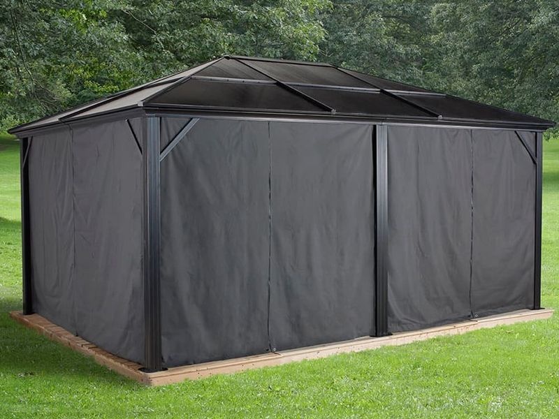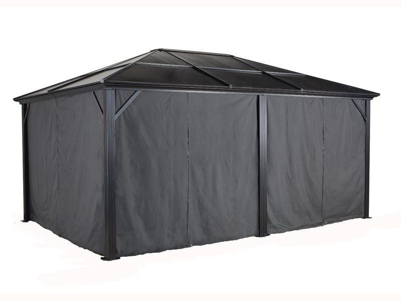 Das Vorhangset ist für den kompletten Pavillon und deckt alle Seiten ab. Durch ein zweigleisiges Laufschienensystem werden die Vorhänge in einer anderen Schiene als die Moskitonetze angebracht. Die Vorhänge werden im geschlossenen Zustand ausschließlich mit den Clips befestigt. Im geöffneten Zustand werden die Vorhänge zusätzlich mit einer Schlaufe an den Pfosten befestigt. Eingang in den Pavillon an jeder Seite mit Reißverschlusstür.