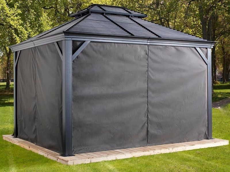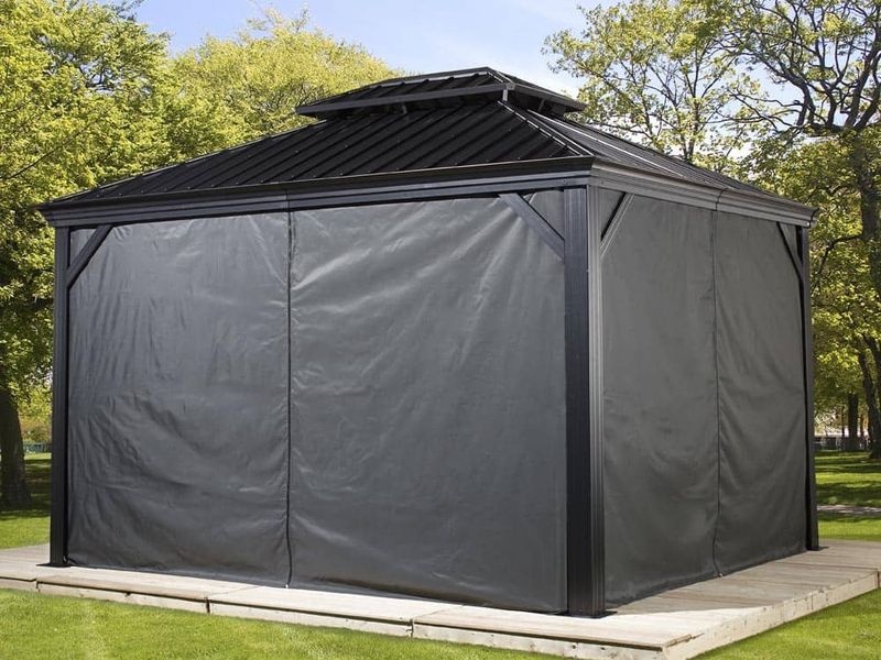 Im geschlossenen Zustand sind die Vorhänge nur mit Clips befestigt. Ein Reißverschluss-Eingang befindet sich an jeder Seite des Pavillons. Im Lieferumfang enthalten sind Vorhänge und Befestigungsclips.