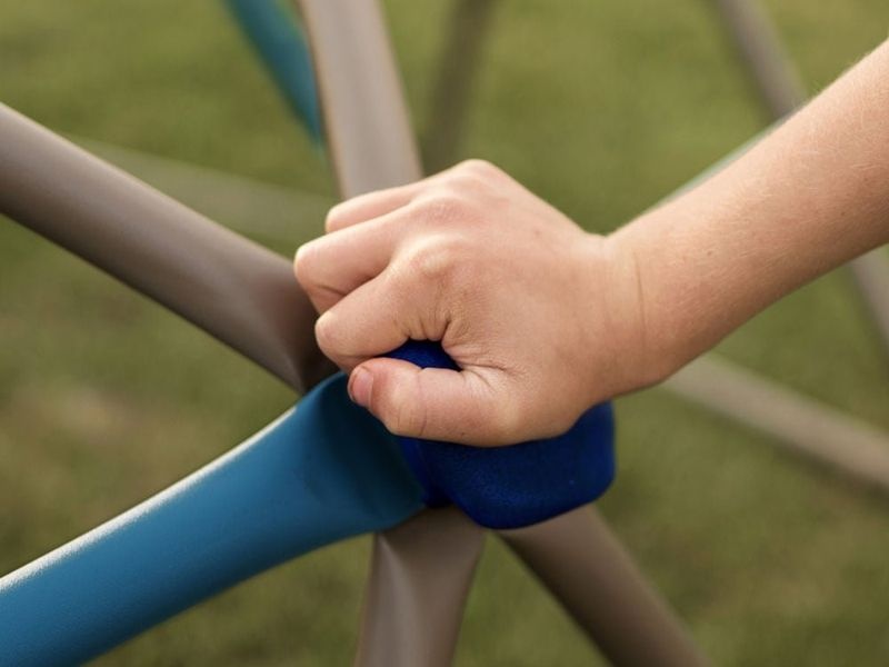 Der Geodome besteht aus einem langlebigen Stahlrahmen mit Pulverbeschichtung und UV-beständigen Farben. Abgerundete Kanten und Gummikappen sorgen für Sicherheit beim Spielen. Die Konstruktion erfordert kein Betonfundament – das Klettergerüst kann überall im Garten einfach aufgestellt werden.