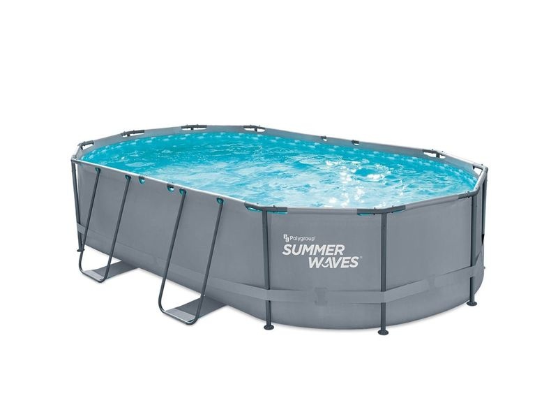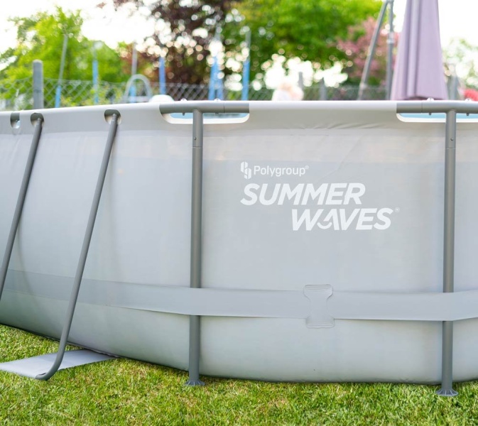 Die Rahmenkonstruktion des Aufstellpools besteht aus verzinkten Stahlrohren. Die graue Außenwand des Pools fügt sich harmonisch in nahezu jeden Garten ein.