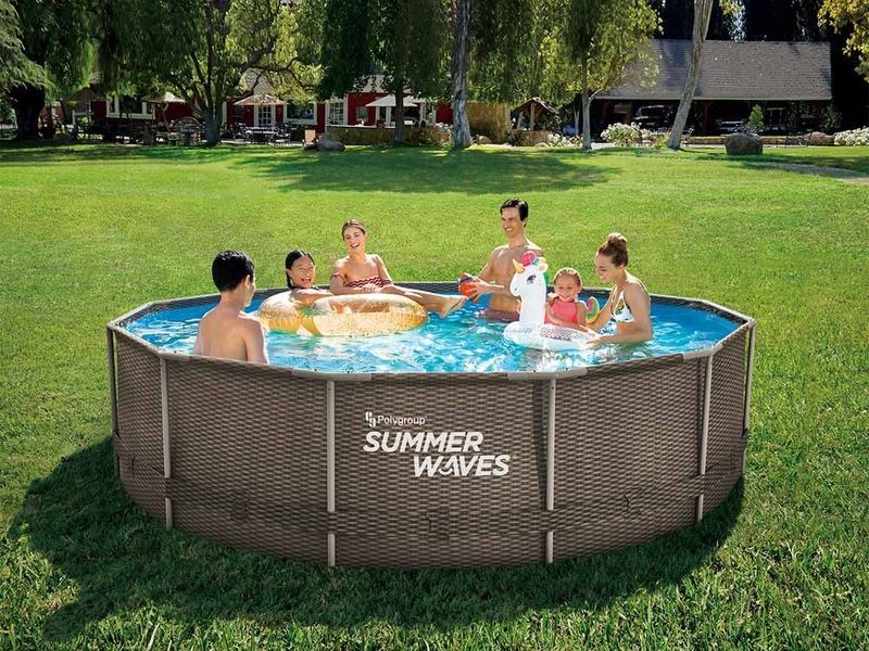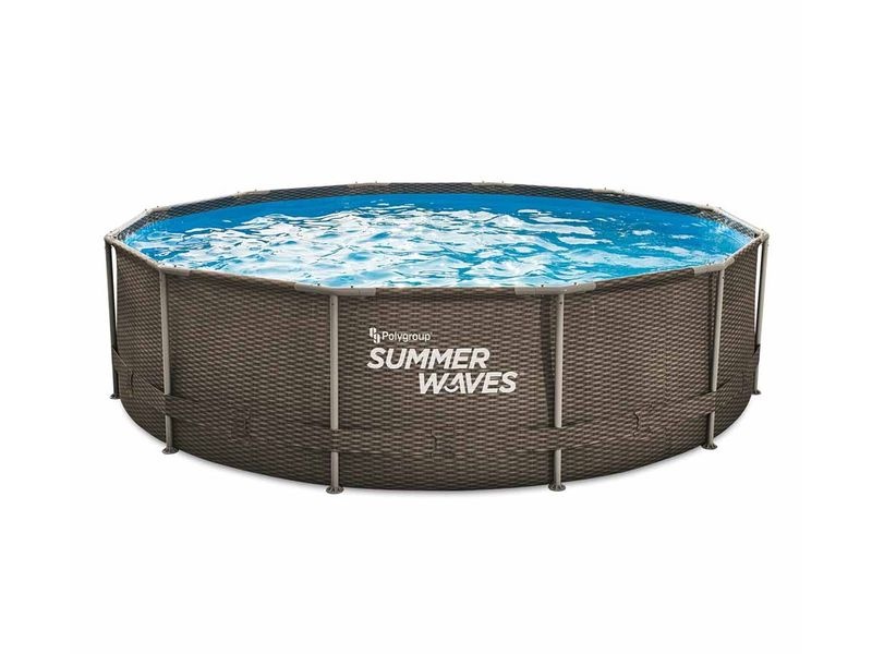 Die Rahmenkonstruktion des Pools besteht aus verzinkten Stahlrohren, die für maximale Stabilität sorgen. Die Außenwand des Pools imitiert eine Rattan-Oberfläche, die sich harmonisch in nahezu jede Gartenlandschaft einfügt.