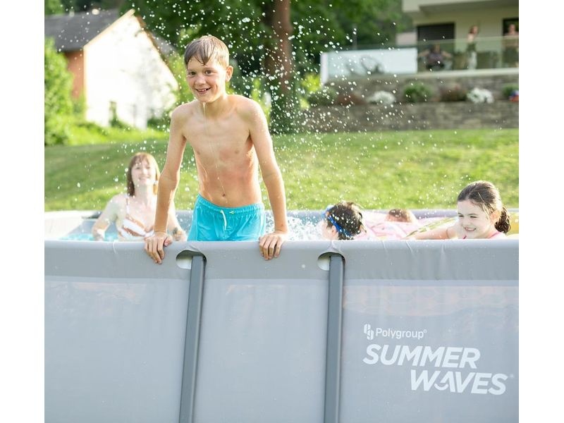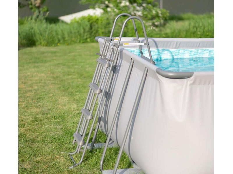 Das Rahmengestell des Aufstellpools besteht aus verzinkten Stahlrohren. Die Außenwand des Pools in elegantem Grauton fügt sich harmonisch in nahezu jeden Garten ein.