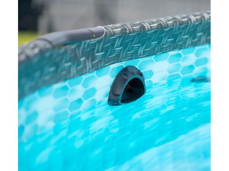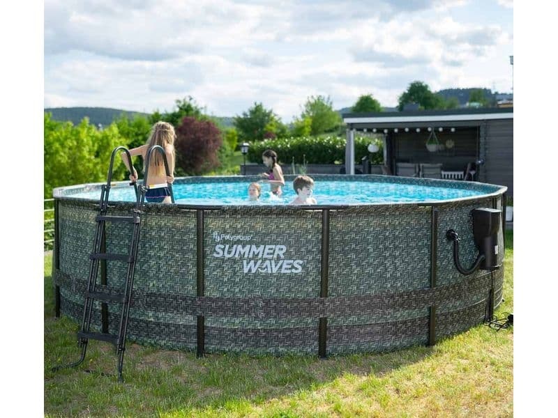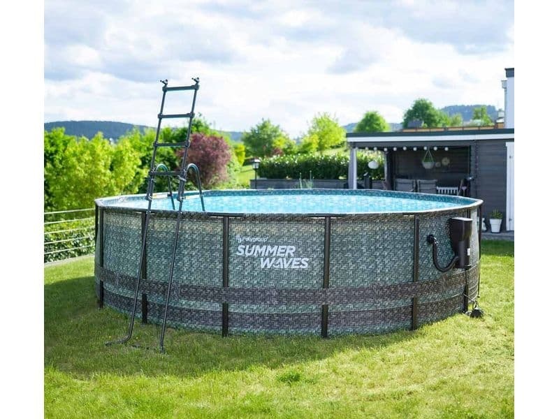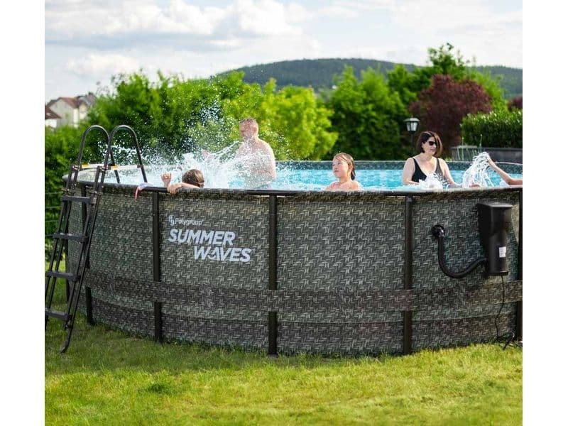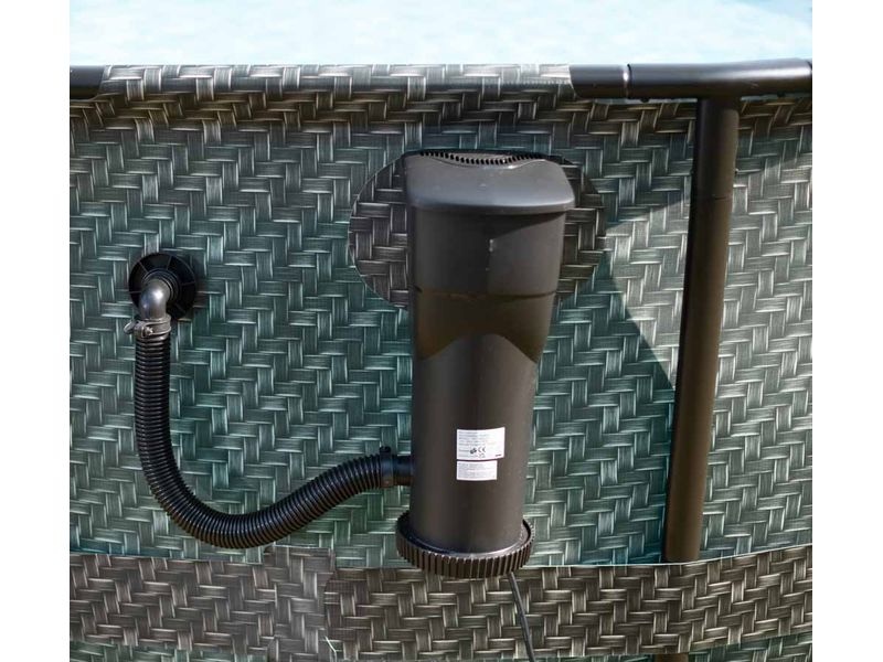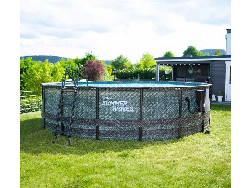 Die Rahmenkonstruktion des Aufstellpools besteht aus Rohren aus beschichtetem Stahl. Die Außenwand des Pools in elegantem Grauton mit Rattan-Optik fügt sich harmonisch in nahezu jeden Garten ein.