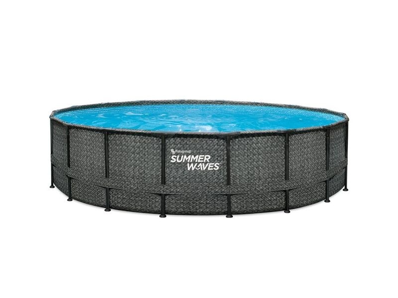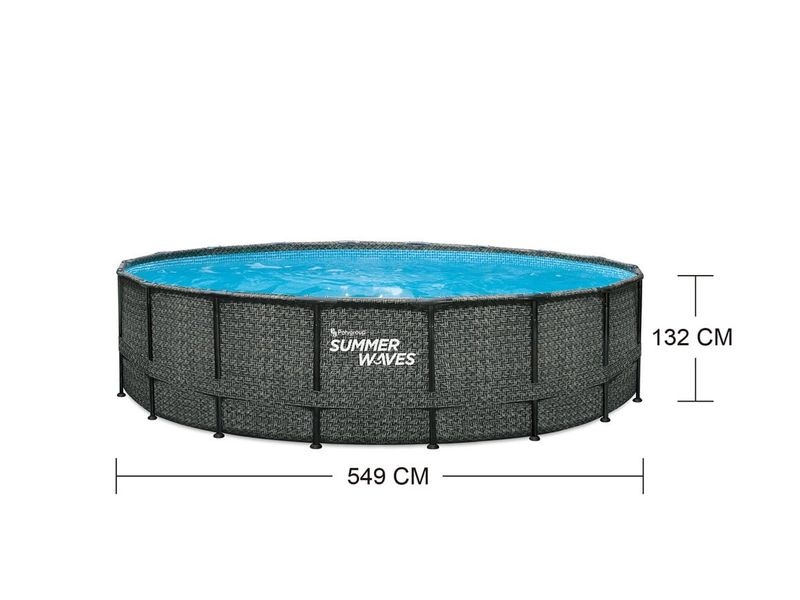 Der Rahmen des Aufstellpools besteht aus verzinkten Stahlrohren. Die Außenwand des Pools ist in eleganter grauer Rattanoptik gehalten und fügt sich harmonisch in nahezu jeden Garten ein.