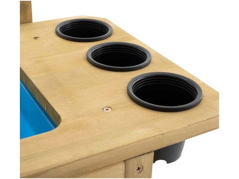 Der Pflanztisch überzeugt mit cleveren Extras: Das Becken lässt sich mithilfe weniger Griffe herausnehmen und als Auffangbehälter für Erde und Wasser verwenden. Über der Schale befindet sich eine verschiebbare Pflanzplatte, durch deren Öffnungen überschüssige Erde einfach durchsickert. Drei Halterungen für Blumentöpfe bieten Platz für Setzlinge oder alternativ für Gartenwerkzeuge. Über dem Becken ist ein leicht zu befüllender Wasserspender angebracht, der für zusätzlichen Spielspaß sorgt. Die vorbereiteten Pflanzen können direkt in das integrierte Hochbeet gesetzt werden. Besonderes Highlight: Die Vorderwand des Hochbeets lässt sich verschieben, sodass Kinder den Wachstumsfortschritt der Setzlinge beobachten können – ein sichtbarer Erfolg, der das Gärtnern noch spannender macht!