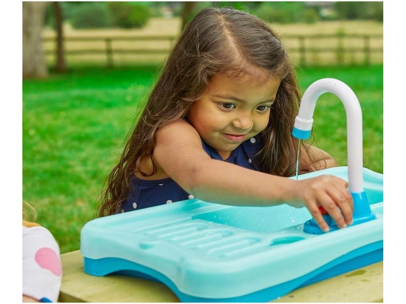 Um das Waschbecken mit Wasser für den funktionierenden Wasserkreislauf zu füllen, genügt es, den Stöpsel im Becken zu öffnen und die gewünschte Menge Wasser einzulassen. Das eingefüllte Wasser wird per Knopfdruck hochgepumpt und fließt anschließend aus dem Wasserhahn.