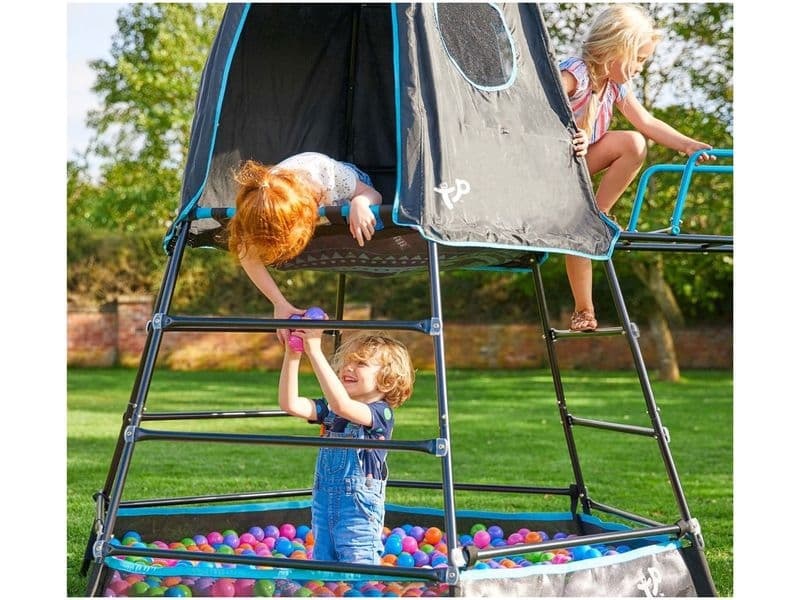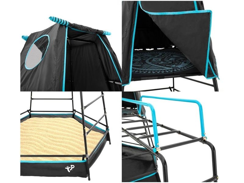 Die Anlage enthält eine Kletterwand mit Kletterstrecke, die mit zwei Griffen für sicheres Hochklettern ausgestattet ist. Der Bereich unter dem Spielturm lässt sich leicht in einen Sandkasten oder einen Ballpool verwandeln. Zum Spielplatz gehört außerdem ein Spielzelt aus robustem Polyester mit bedrucktem Boden und zwei Eingängen – ideal für fantasievolles Spielen und Verstecken.