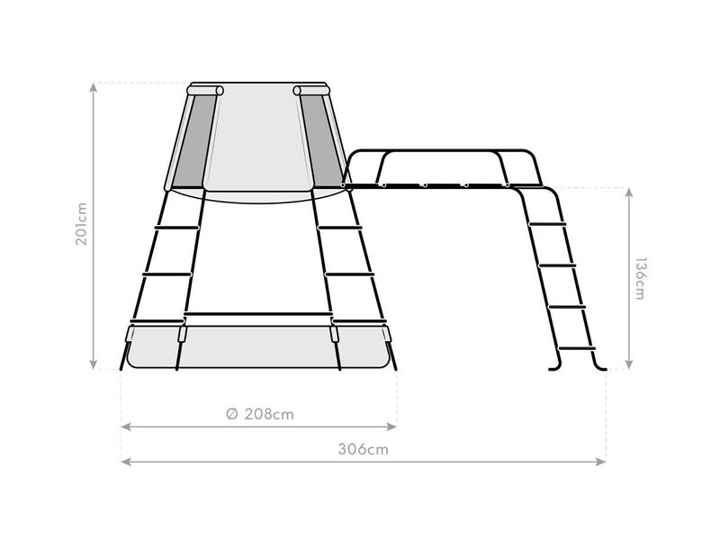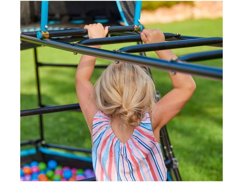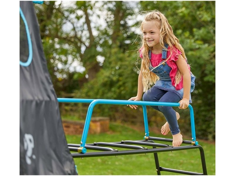 Das Spielgerät besteht aus einem robusten, pulverbeschichteten Stahlrahmen, der hohe Stabilität und lange Lebensdauer garantiert. Abgerundete Kanten und hochwertige Materialien sorgen für zusätzliche Sicherheit. Die Konstruktion ist so konzipiert, dass nur minimaler Wartungsaufwand erforderlich ist. Das Klettergerüst ist für bis zu zwei Kinder mit einem Gesamtgewicht von maximal 100 kg ausgelegt.