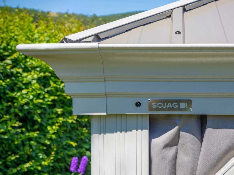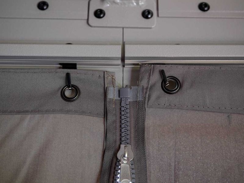 Das Vorhang-Set ist für den gesamten Pavillon bestimmt. Es bedeckt alle Seiten, wobei die Vorhänge dank eines Doppelschienensystems auf einer separaten Schiene von den Insektenschutznetzen befestigt sind. Dadurch wird eine einfachere Handhabung gewährleistet.