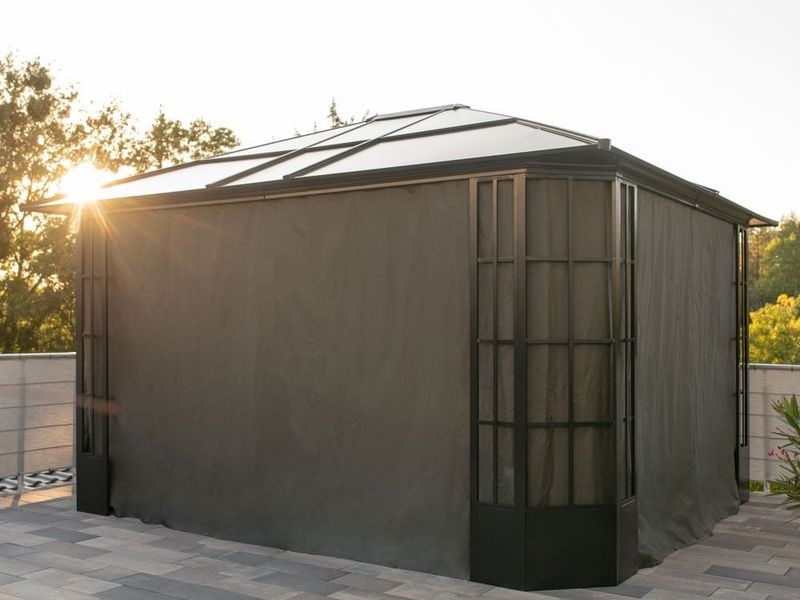Im geschlossenen Zustand sind die Vorhänge nur mit Clips befestigt. Ein Reißverschluss-Eingang befindet sich an jeder Seite des Pavillons. Im Lieferumfang enthalten sind Vorhänge und Befestigungsclips.