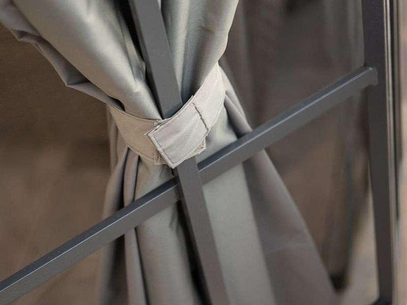 Das Vorhang-Set ist für den gesamten Pavillon bestimmt. Es bedeckt alle Seiten, wobei die Vorhänge dank eines Doppelschienensystems auf einer separaten Schiene von den Insektenschutznetzen befestigt sind. Dadurch wird eine einfachere Handhabung gewährleistet.