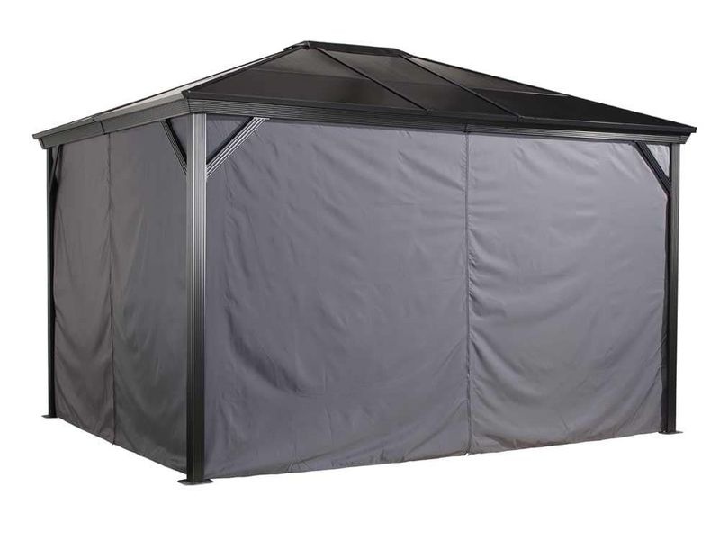 Das Vorhang-Set ist für den gesamten Pavillon bestimmt. Es bedeckt alle Seiten, wobei die Vorhänge dank eines Doppelschienensystems auf einer separaten Schiene von den Insektenschutznetzen befestigt sind. Dadurch wird eine einfachere Handhabung gewährleistet.