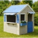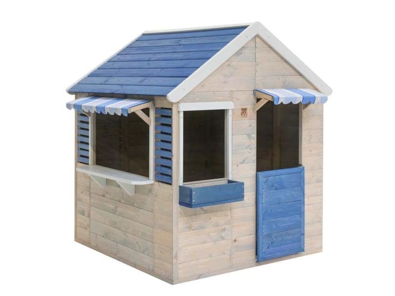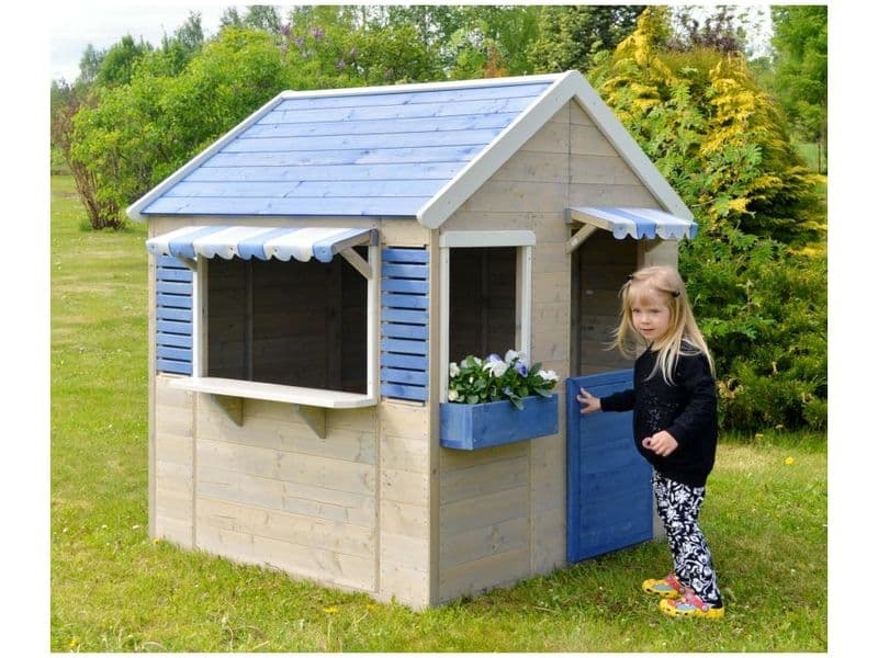 Das Spielhaus besticht durch seine natĂĽrliche Optik aus Kiefernholz. Ein Fenster mit Blumenkasten und ein weiteres mit gestreifter Markise verleihen dem Haus einen besonderen, charmanten Charakter, der sowohl Kinder als auch Erwachsene begeistert.