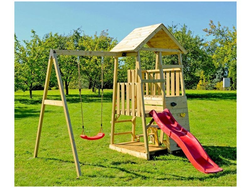 Der Spielturm ist mit einer Rutsche ausgestattet, die sowohl über eine Leiter als auch über eine Kletterwand erreichbar ist. Ihr Kind kann sich im Turm ein geheimes Versteck einrichten oder sich in verschiedene kreative Spiele vertiefen. Darüber hinaus sorgt die Schaukel für zusätzlichen Spaß. Unter dem Turm befindet sich ein Picknicktisch.