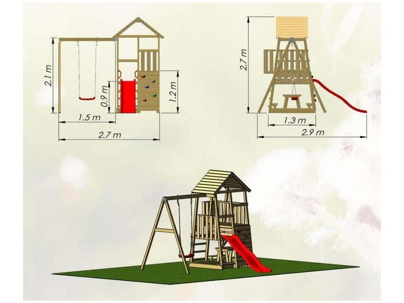 Der Spielturm mit den Maßen 290×270×270 cm ist eine praktische und unterhaltsame Ergänzung für Ihren Garten. Zum Turm gehören eine Rutsche, eine Schaukel, eine Kletterwand und ein Picknicktisch, die Kindern großartige Spielmöglichkeiten bieten. Er ist ein idealer Ort für Abenteuer und kreative Spiele, die Ihre Kinder begeistern und lange beschäftigen.