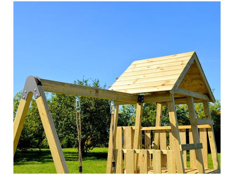 Der Spielturm ist aus widerstandsfähigem nordischem Kiefernholz gefertigt, das eine lange Lebensdauer und Sicherheit für Ihre Kinder gewährleistet. Alle verwendeten Materialien erfüllen strenge Sicherheitsstandards, bestätigt durch das FSC-Mix-70%-Zertifikat und die EN71-Norm. Die Tragfähigkeit des Turms beträgt 100 kg, die Schaukel ist bis 50 kg belastbar.