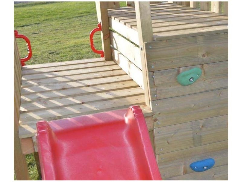 Der Spielturm ist mit einer Rutsche ausgestattet, die sowohl über eine Leiter als auch über eine Kletterwand erreichbar ist. Ihr Kind kann sich im Häuschen eine geheime Höhle einrichten oder sich in verschiedene kreative Spiele vertiefen. Zusätzlich sorgt das integrierte Podest für noch mehr Spielspaß.
